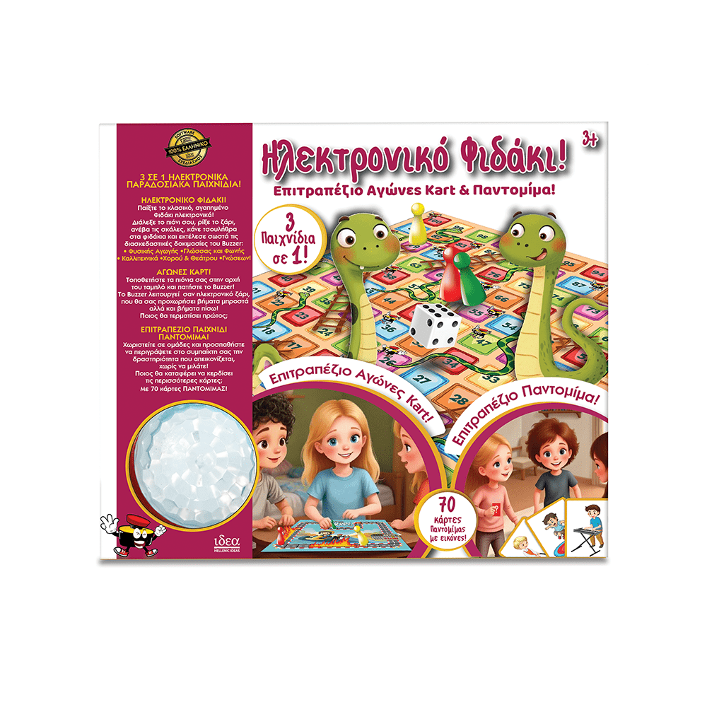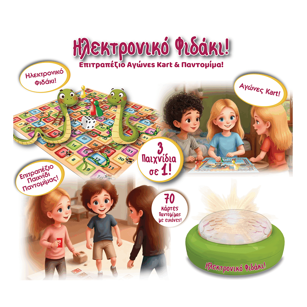 Περιλαμβάνει 2 ηλεκτρονικά παραδοσιακά παιχνίδια – ΗΛΕΚΤΡΟΝΙΚΟ ΦΙΔΑΚΙ & ΕΠΙΤΡΑΠΕΖΙΟ ΑΓΩΝΕΣ KART καθώς και ΠΑΙΧΝΙΔΙ ΠΑΝΤΟΜΙΜΑ με κάρτες, που απεικονίζουν καθημερινές δραστηριότητες των παιδιών.
