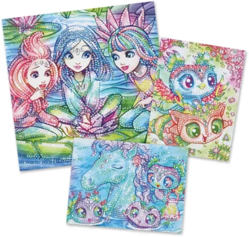 Δημιουργήστε 3 εκθαμβωτικά αριστουργήματα! Χρησιμοποιήστε ένα ειδικό απλικατέρ για να εφαρμόσετε στρασάκια σε αυτοκόλλητα πρότυπα. Ακολουθήστε τους αριθμούς που αντιστοιχούν σε κάθε χρώμα. Το τελικό αποτέλεσμα είναι εκπληκτικό!