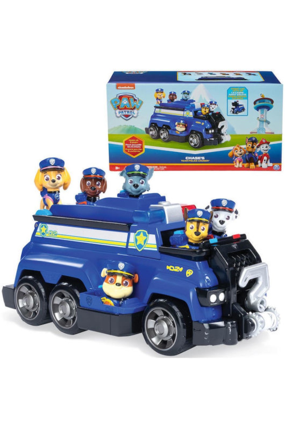 Ζήστε συναρπαστικές αποστολές διάσωσης με το Team Cruiser του Chase και 6 φιγούρες PAW Patrol! Αυτό το εντυπωσιακό όχημα έχει μήκος πάνω από 25 εκατοστά και διαθέτει θέσεις για και τα 6 κουτάβια! Το σετ περιλαμβάνει φιγούρες των Marshall, Chase, Skye, Rubble, Rocky & Zuma, ντυμένες με τις αποκλειστικές αστυνομικές στολές PAW Patrol, για ατελείωτες περιπέτειες. Όταν οι φίλοι βρίσκονται σε δύσκολη θέση, άνοιξε το αστυνομικό οδόφραγμα για να αποκλείσεις την περιοχή, στη συνέχεια επέκτεινε χειροκίνητα τον γάντζο ρυμούλκησης και σύνδεσέ τον με τον στόχο σου και περιστρέψτε τον για να τραβήξεις το σχοινί ρυμούλκησης και να τους τραβήξεις σε ασφαλές μέρος! Όταν ολοκληρωθεί η αποστολή, βάλε τα κουτάβια στα καθίσματά τους και τρέξε στην επόμενη αποστολή σου!