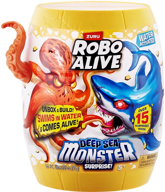 Βούτηξε στα βάθη της περιπέτειας με το Robo Alive Deep Sea Monster Surprise! Άνοιξε το βαρέλι και εξερεύνησε τα διαμερίσματά του για να ανακαλύψεις πάνω από 15 συναρπαστικές εκπλήξεις, όπως slime και ένα εντυπωσιακό θαλάσσιο πλάσμα που ενεργοποιείται με το νερό! Θα συναρμολογήσεις τον ύπουλο χταπόδι ή τον τολμηρό καρχαρία; Κάθε πλάσμα ζωντανεύει μόλις έρθει σε επαφή με το νερό, προσφέροντας μια μοναδική υποβρύχια εμπειρία παιχνιδιού.